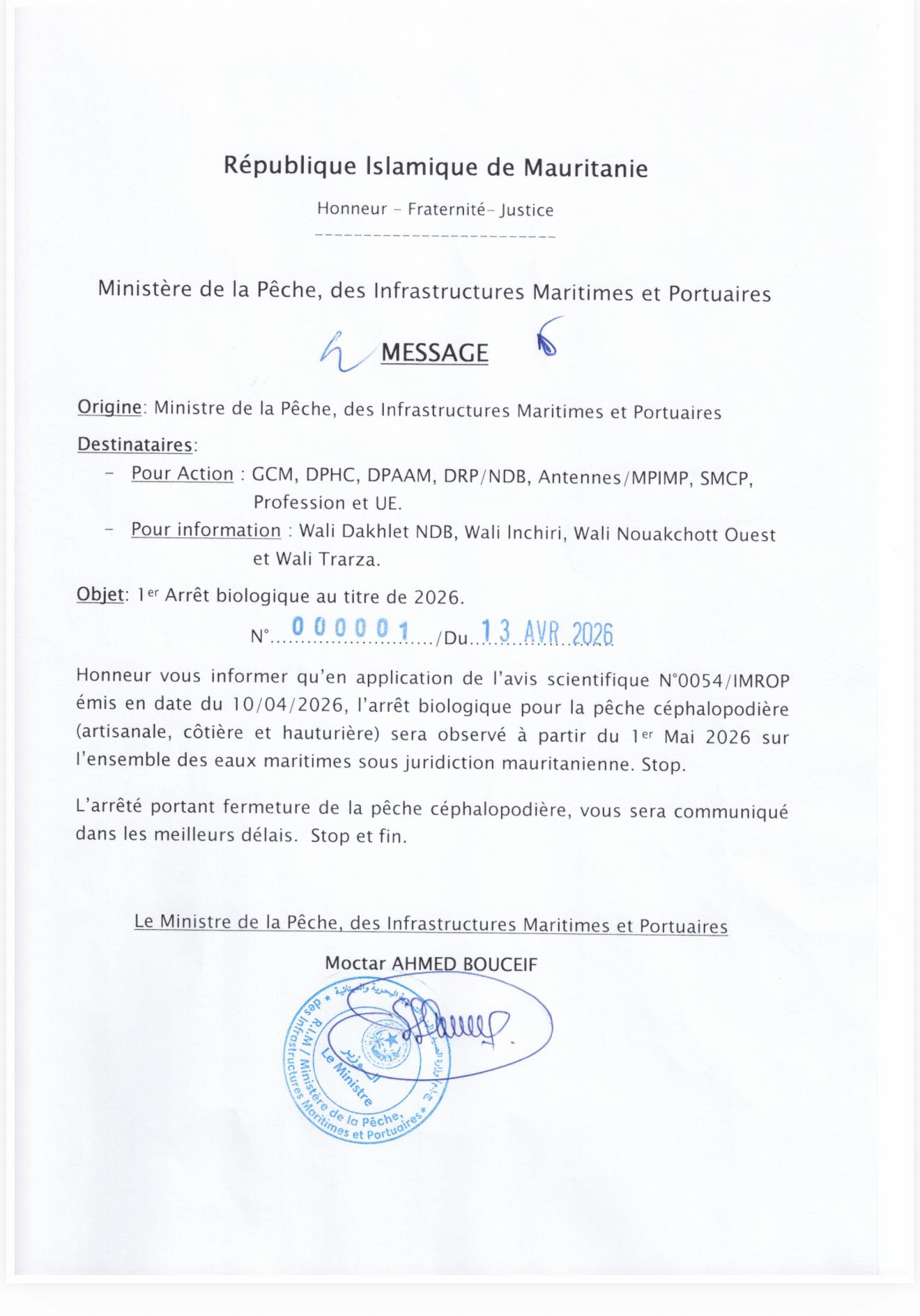 وزارة الصيد الموريتاني: التوقف البيولوجي لصيد رأسيات الأرجل سيكون ابتداءً من فاتح مايو 2026