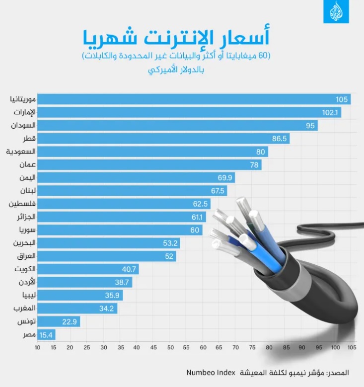 نتائج لافتة أسفرت عنها مقارنة أجرتها الجزيرة نت لأسعار الاتصالات الهاتفية والإنترنت في الدول العربية حسب مؤشر "نيمبو" لتكلفة المعيشة، وهو من أبرز المؤشرات التي يستدل بها في التقارير الدولية والحكومية في مجالات ترتيب دول العالم في مجالات حيوية، مثل تكلفة المعيشة ومستوى الأمن والجريمة وغيرها، إذ تصدرت موريتانيا -وهي من أفقر دول المنطقة- قائمة أغلى الدول العربية من ناحية تكلفة الاتصالات الهاتفية والإنترنت، في المقابل احتلت مصر صدارة قائمة أرخص دول المنطقة في أسعار المكالمات والإنترنت.