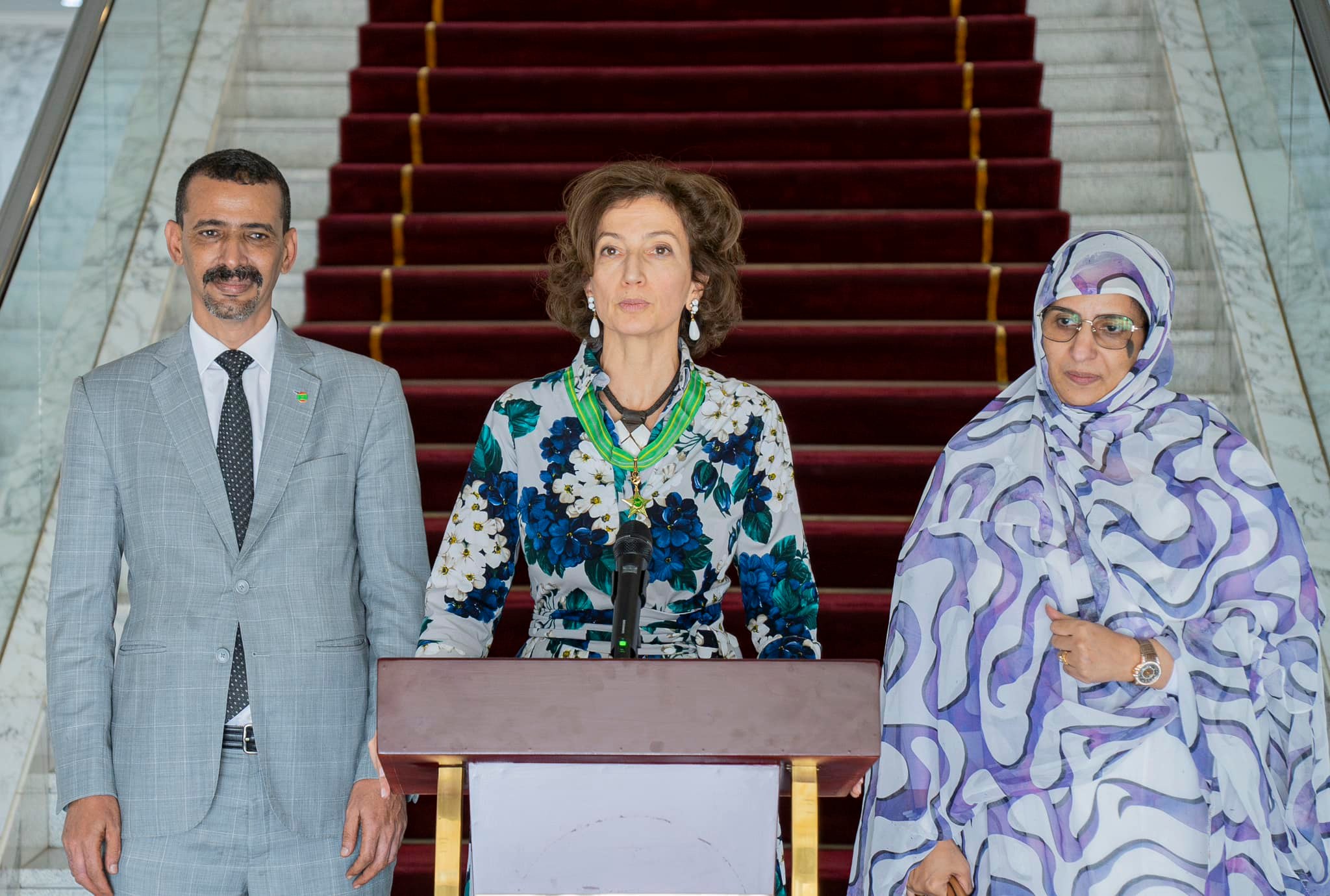 وفي تصريح للمديرة العامة لليونسكو عبّرت عن سعادتها وخالص شكرها وتقديرها لرئيس الجمهورية على الدعوة الكريمة في أول زيارة رسمية لها إلى موريتانيا وهي على رأس هذه الهيئة، مضيفة أنها ناقشت مع صاحب الفخامة مواضيع هامة منها التراث الثقافي الغني جدا للبلاد، قائلة إنها تغتنم هذه الفرصة لتهنئة موريتانيا مرة أخرى على إدراج ملحمة صامبا گالاديو على قائمة التراث غير المادي لليونسكو قبل أيام، بالإضافة إلى إدراج المحظرة العام الماضي، مشيدة في نفس السياق بدورها في حفظ ونقل المعرفة.