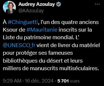 أشادت المديرة العامة لمنظمة الأمم المتحدة للتربية والعلم والثقافة (اليونسكو) أودري أزولاي، عبر سلسلة من التغريدات، على صفحتها على منصة إكس، وعلى موقع اليونسكو، بمهرجان مدائن التراث الذي حضرت نسخته الثالثة عشرة بدعوة من فخامة رئيس الجمهورية السيد محمد ولد الشيخ الغزواني.