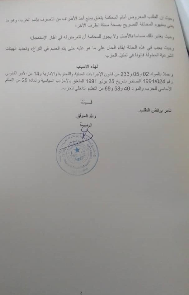 وقالت المصادر إن المجموعة طالبت في العريضة بتوقيف عمل هيئات الحزب، خصوصا عميلة الانتساب التي افتتحها الحزب قبل شهر، وهو الطلب الذي رفضته الغرفة المدنية اليوم، تأسيسا على المادة 69 من النظام الداخلي للحزب، التي طرد على أساسها رئيس الحزب أحمد ولد داداه بعض المنشقين عن خط حزبه.