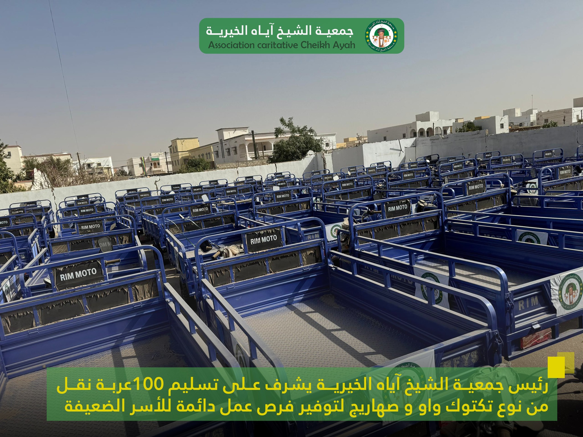 أشرف رئيس جمعية الشيخ آياه الخيرية، الشيخ الطالب بوي ولد الشيخ آياه ، صباح اليوم عند ملتقى طرق الزيتونة في لكصر، على توزيع 100 عربة نقل من نوع "تكتوك" و"واو" وصهاريج**، وذلك في إطار مبادرة تهدف إلى توفير فرص عمل دائمة للأسر الضعيفة.