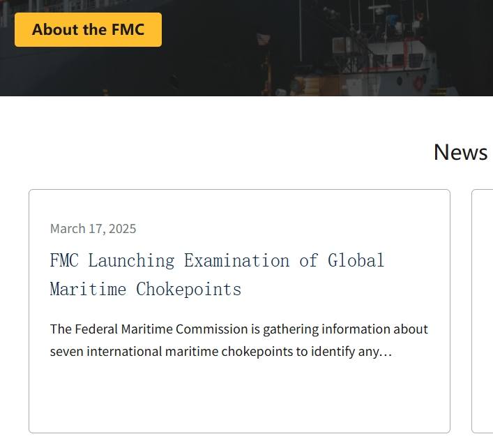 لجنة النقل البحري الفيدرالية الأمريكية (FMC) تفتح تحقيقًا بشأن نقاط الاختناق البحرية العالمية في سبعة ممرات بحرية رئيسية: القناة الإنجليزية، مضيق ملقا، الممر البحري الشمالي، قناة السويس، مضيق سنغافورة، قناة بنما، مضيق جبل طارق.