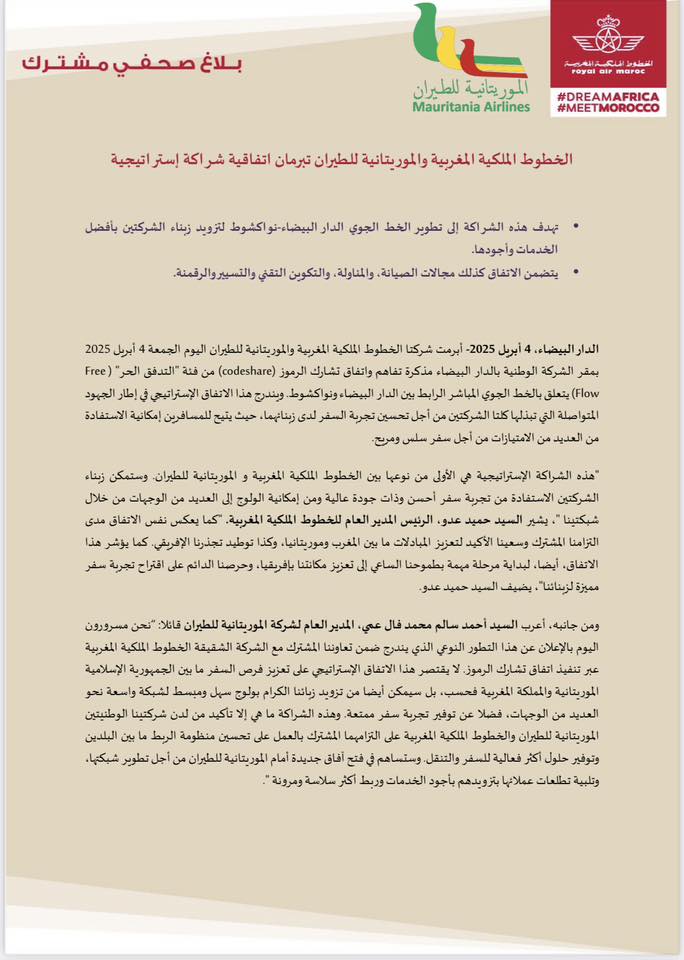 تم يوم أمس الجمعة بالدار البيضاء توقيع مذكرة تفاهم تتضمن شراكة استراتيجية بين الموريتانية للطيران والخطوط الملكية المغربية، وتوقيع اتفاق لتشارك الرموز (codeshare) بين الشركتين.