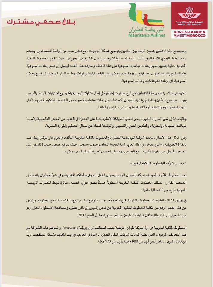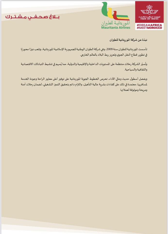 الموريتانية للطيران توقع اتفاقية شراكة مع الخطوط الملكية المغربية(نص الاتفاق)