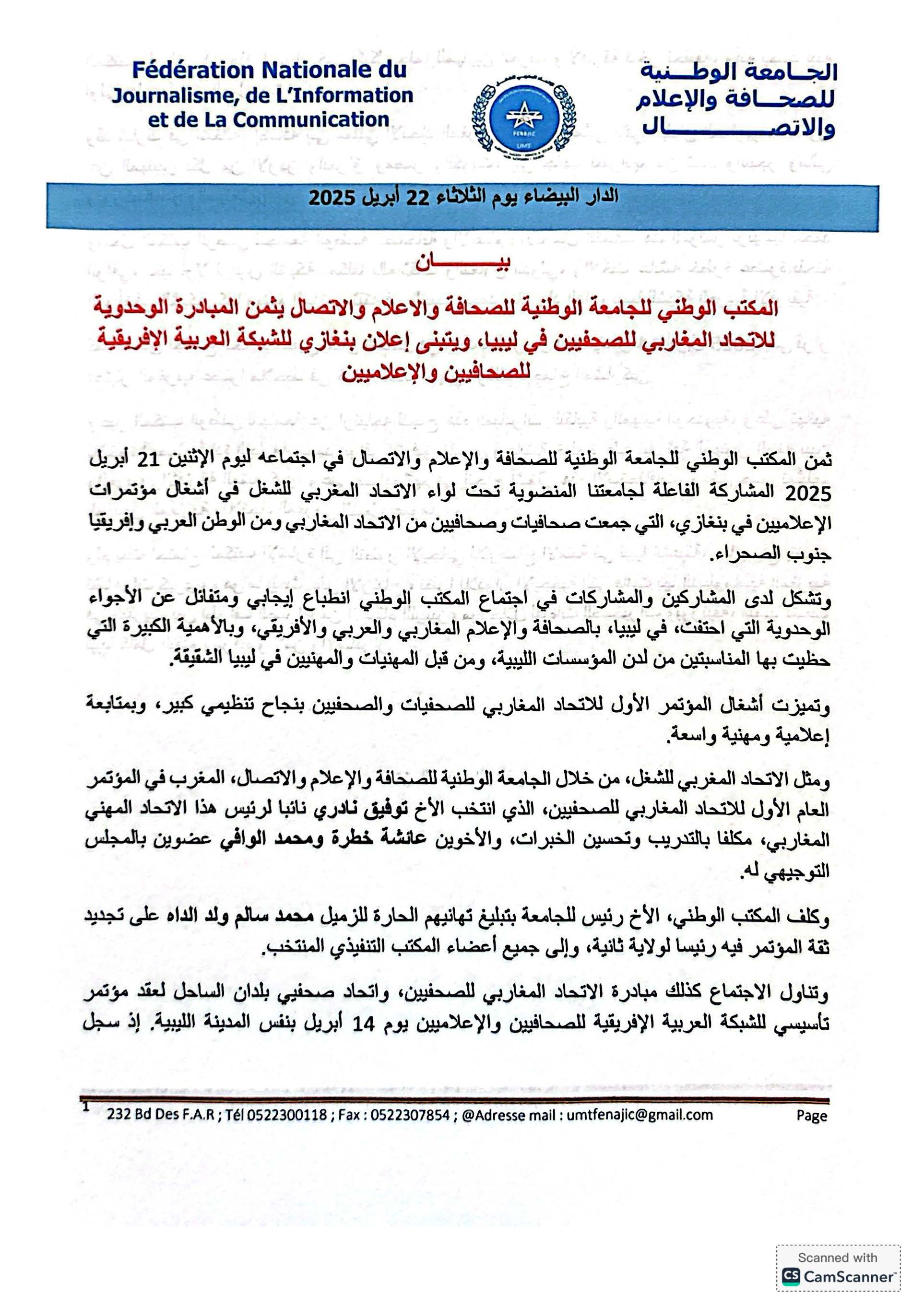 ثمن المكتب الوطني للجامعة الوطنية للصحافة والإعلام والاتصال في اجتماعه مساء امس بالدار البيضاء المشاركة الفاعلة للجامعة في أشغال مؤتمر الاتحاد المغاربى للصحفيين والإعلاميين في بنغازي التي جمعت صحافيات وصحفيين من مختلف بلدان الاتحاد المغاربي و الوطن العربي وإفريقيا جنوب الصحراء.