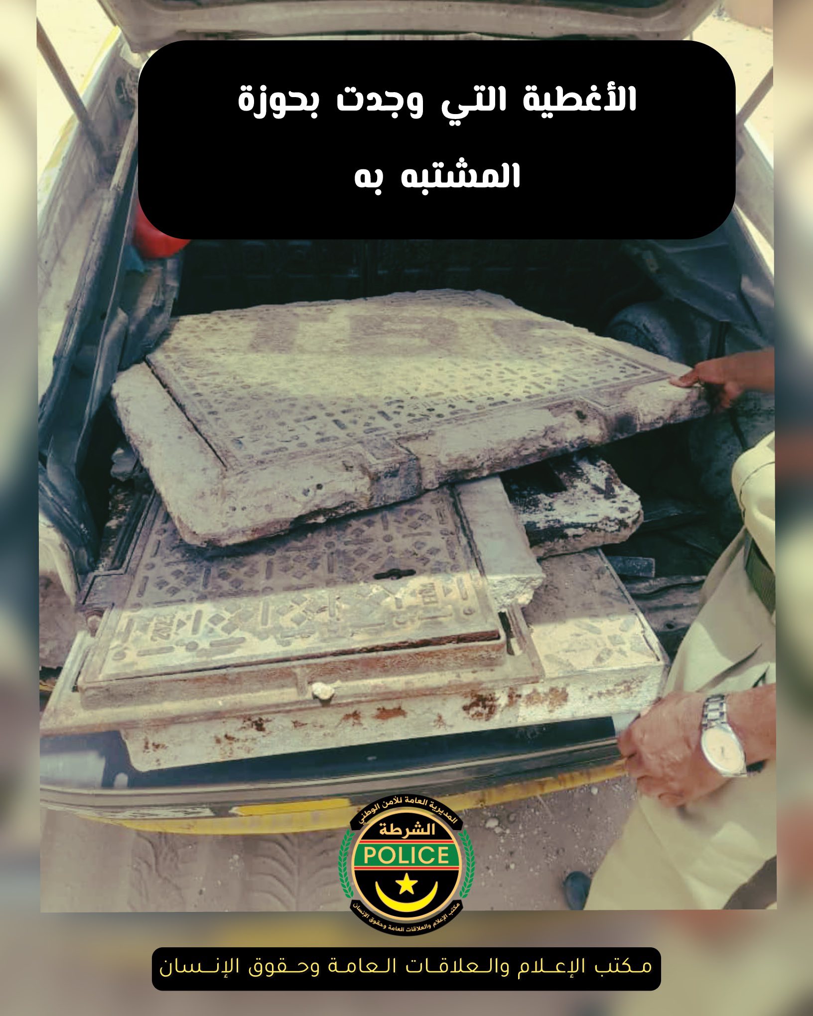 قالت الشرطة الموريتانية إنه بعد ملاحظة سرقة غطاء خزانات الصرف الصحي والتوصيلات (كابلات) وغيرها من أغطية الخدمات العمومية، تم تكثيف البحث عن الجناة حيث تمكنت دورية مفوضية الرياض2 في ولاية نواكشوط الجنوبية من القبض على المشتبه به متلبسا بحيازة كمية من أغطية نقاط تابعة للكابل الخاص بشبكات الاتصال وأقر بسرقتها و بأنه يبيعها لتجار الخردة وقد أرشدنا إلى الأماكن التي سرقها منها.