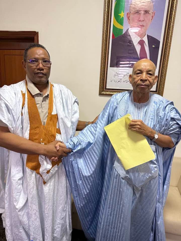 رئيس الرابطة الوطنية لتخليد بطولات المقاومة ولد بكار يسلم باسم الرابطة لمنسق الحوار موسى فال رسالة بمقترحات حول مواضيع الحوار