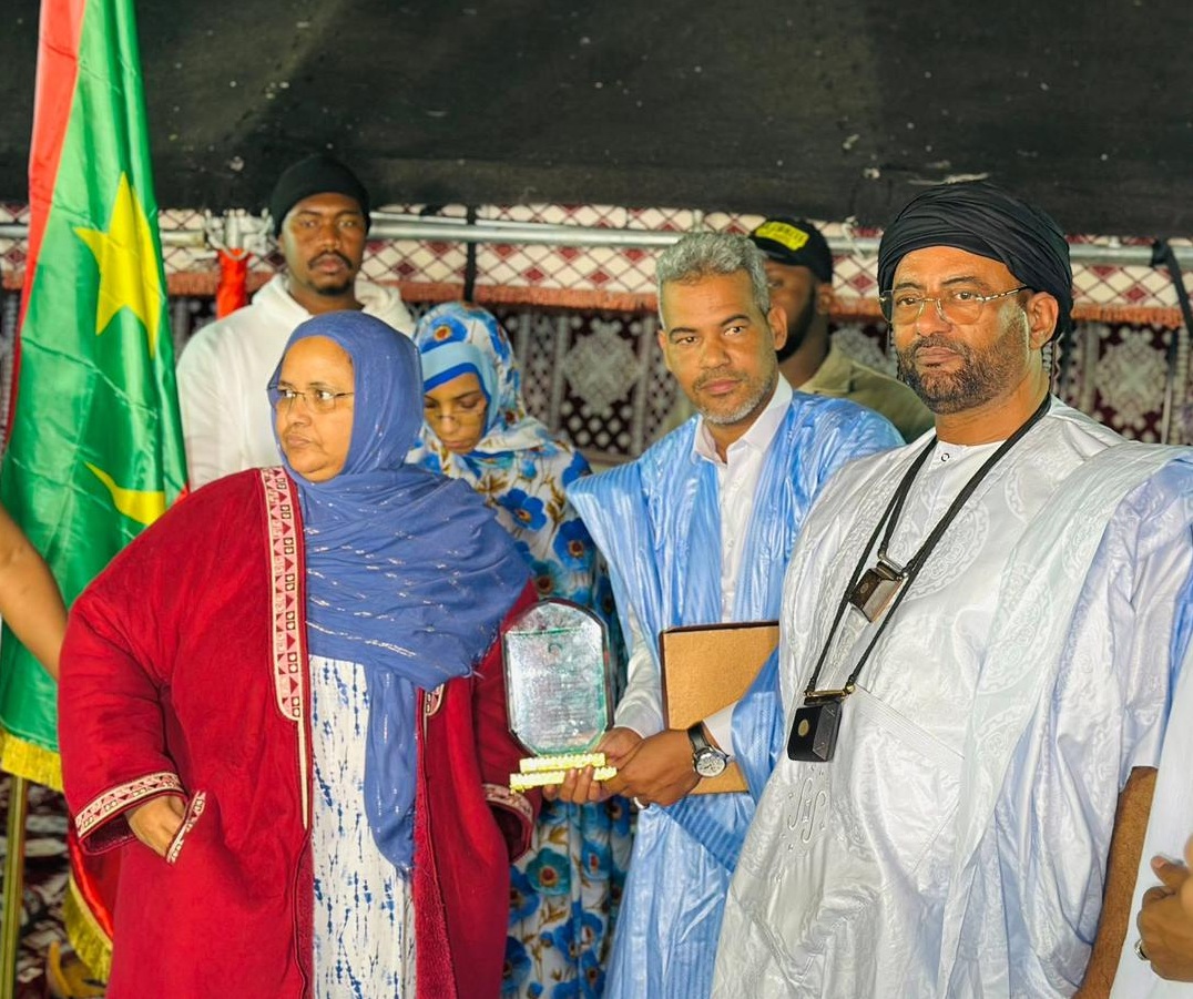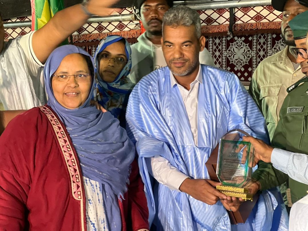تسلم رئيس النقطة الصحية تكريمه من طرف حاكم مقاطعة المذرذرة محمد محمود ولد الفاظل وفضيلة الـخليفة العام للطريقة القادرية في غرب أفريقيا الشيخ عبد العزيز بن الشيخ آياه والشيخة العزة بنت الشيخ آياه.