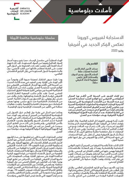 مع إلقاء الضوء على السرعة التي تأقلم بها المجال الدبلوماسي الأفريقي مع الواقع الجديد لممارسة العمل، تبرز هذه النسخة من التأمات الدبلوماسية التي تصدرها أكاديمية الإمارات الدبلوماسية المشاورات الافتراضية العديدة بين صانعي القرار لرسم الطريق المشترك للمُضي قدماً.