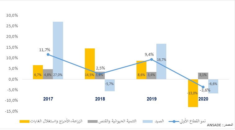 لقد عرف القطاع الأولي انخفاضًا في معدل نموه بلغ (-3.7٪) سنة 2020، بعد أن حقق نموا قُدر ب (+9.4٪) سنة 2019. وبلغت مساهمته في نمو الناتج المحلي الإجمالي (-0.79 ٪) سنة 2020. ويرجع هذا الانخفاض في القطاع الأولي إلى النتائج السلبية المحققة على مستوى كل من الزراعة والصيد البحري.