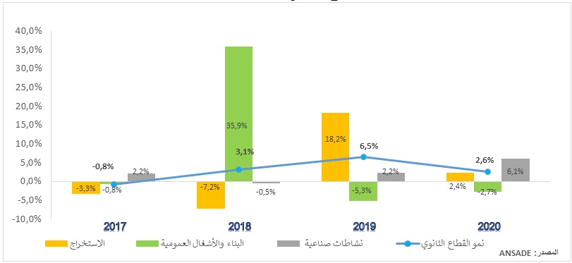 القطاع الثانوي كان الوحيد من بين القطاعات الذي صمد أمام ارتدادات موجة الوباء وحقق في مجمله معدل نمو موجب (+2.6%) سنة 2020، وبلغت مساهمته في نمو الناتج المحلي الإجمالي الحقيقي ب +0.7 نقطة مئوية.