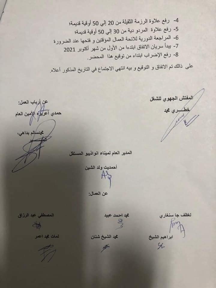 أعلن اليوم الأربعاء عن توقيع اتفاق بين الحمالة في ميناء نواذيبو وإدارة الميناء وأرباب العمل، بإشراف مفتشية الشغل وسلطة منطقة نواذيبو الحرة. هذا الاتفاق ينهي إضرابا دام عدة أسابيع بالميناء. وهذه تفاصيل الاتفاق: