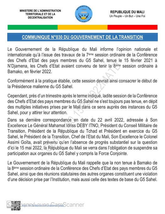 وكان من المفترض أن تستضيف باماكو في شباط/فبراير 2022 مؤتمرا لقادة دولها على أن "تكرّس بدء ولاية الرئاسة المالية لمجموعة دول الساحل الخمس" لكن "بعد مرور نحو ثلاثة أشهر" على هذا الموعد "لم يعقد" الاجتماع، وفق البيان.