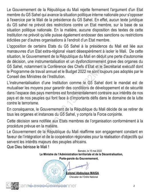 لهذا السبب أعلنت مالي انساحبها من مجموعة دول الساحل الخمس ومن قوّتها العسكرية لمكافحة الجهاديين(وثيقة)
