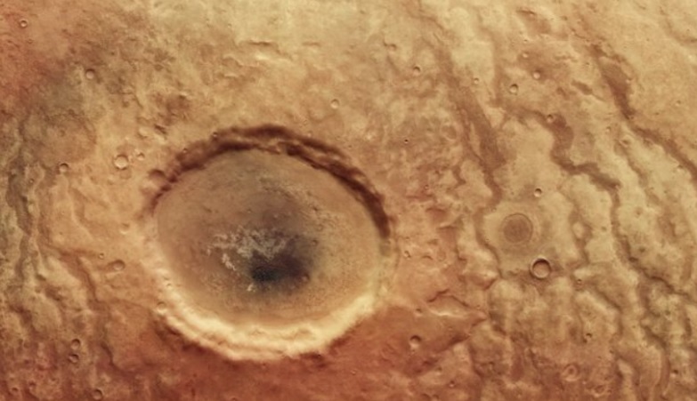 بينما تنتشر على سطح الكوكب الأحمر فوهات ضخمة ناتجة عن اصطدام الكويكبات أو النيازك أو المذنبات، التقطت مركبة الفضاء "مارس أكسبريس" التابعة لوكالة الفضاء الأوروبية، صورة لفوهة بركان على سطح المريخ.