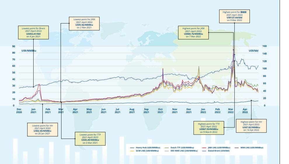 وبحسب التقريركانت أسعارالغاز المسال خلال السنة المنصرمة عرضة لتقلبات عنيفة، حيث انتقلت من حوالي 16.474 دولار لكل مليون وحدة حرارية بريطانية بداية العام إلى حوالي 5.563 دولار بداية مارس، ووصلت إلى أعلى مستوى سنوي حوالي 56.326 دولار لكل مليون وحدة حرارية بريطانية في 6 أكتوبر 2021، وذلك حسب مؤشر اليابان-كوريا (JKM) الذي يتم تقييمه بواسطة بلاتس (Platt’s) –وهو معيار لسعر الغاز الطبيعي المسال في السوق الأسيوي أساسا.