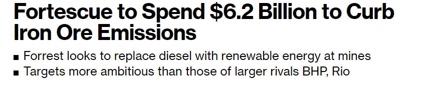 أعلنت مجموعة Fortescue Metals الأسترالية عن خطة بقيمة 6.2 مليار دولار للتخلص من الوقود الأحفوري وانبعاثات الكربون من عملياتها المنجمية بحلول 2030 . وستنفق الشركة الرابعة عالميا من حيث إنتاج خامات الحديد 3.2 مليار دولار لبناء 2 إلى 3 جيجاوات من الطاقة المتجددة وبطاريات التخزين وخطوط النقل والبنية التحتية للشحن بمشاريعها في منطقة بيلبارا في غرب أستراليا. FMG التي تأسست 2003 و بدأت تصدير خام الحديد 2008 أصبح اليوم إنتاجها يحوم حول 200 مليون طن للسنة و تقود الشركات في مجال إزالة الكربون من صناعة التعدين التي تعد حلقة مهمة في مجال انبعاثات صناعة الحديد والصلب التي تطلق سنويا 3.4 مليار طن من الكربون ، وهو ما يعادل 7% من الانبعاثات العالمية، بحسب وود ماكنزي.