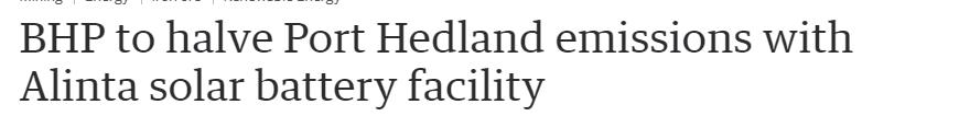 من جهة أخرى وقعت مجموعة بي إتش بي بيليتونBHP العملاقة اتفاقية مع شركة Alinta Energy بخصوص توليد 45 ميجا وات من الطاقة باستخدام الألواح الشمسية في غرب أستراليا مما سيسمح بتلبية جميع احتياجات ميناء هيدلاند لتصدير خامات الحديد من الطاقة بحلول عام 2024 مع تخفيف في الانبعاثات بنسبة 30 ٪ مقارنة بمستواها 2020 ، و تخطط الشركة للوصول إلى صافي انبعاثات صفرية بحلول عام 2051.