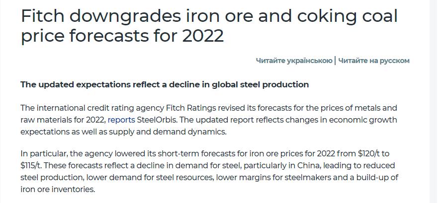 عدلت وكالة التصنيف الائتماني فيتش توقعاتها لأسعار خامات الحديد حيث خفضت توقعاتها إلى 115 دولارا للطن بدلا من 120 دولارا لهذا العام كما توقعت الوكالة وصول الأسعار إلى 85 و 75 و70 دولارا للطن بالسنة للسنوات 2023 و2024 و2025 على التوالي.