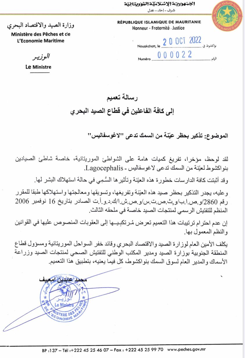 حذرت وزارة الصيد و الاقتصاد البحري الموريتانية من بيع واستخدام نوع من السمك يقال له لاغوسفاليس ووصفته بالسام.