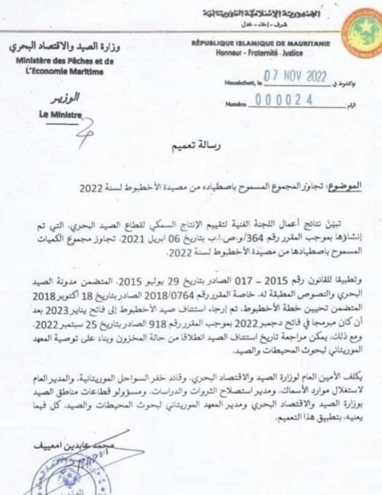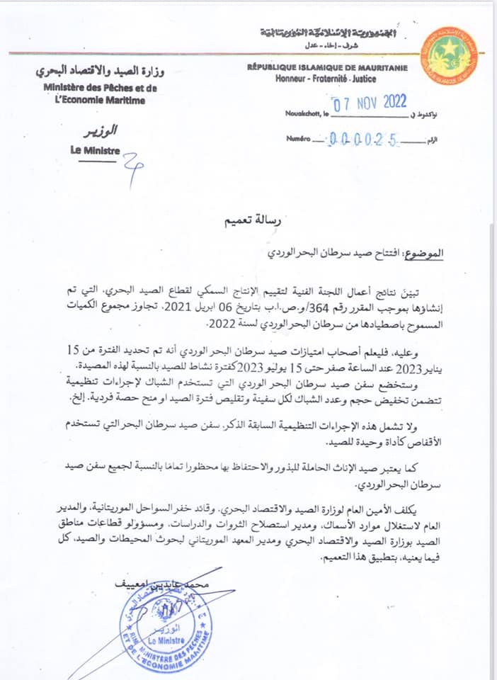 أصدر وزير الصيد والاقتصاد البحري الموريتاني محمد عابدين امعييف اليوم الإثنين تعميمين.
