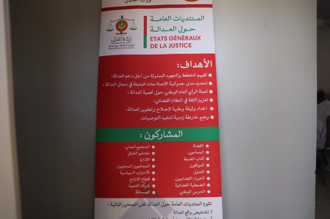 أطلقت وزارة العدل اليوم السبت فعاليات المنتديات الجهوية للعدالة على مستوى دوائر الاستئناف بألاك (عاصمة ولاية لبراكنه)، وكيفة (عاصمة لعصابة)، و انواذيبو (داخلت انواذيبو)..