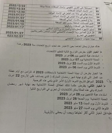 وجاء في بيان للجنة أنه سيتم استدعاء هيئة الناخبين يوم 28 فبراير 2023، على أن تنطلق الحملة الانتخابية يوم الجمعة 28 إبريل 2023.