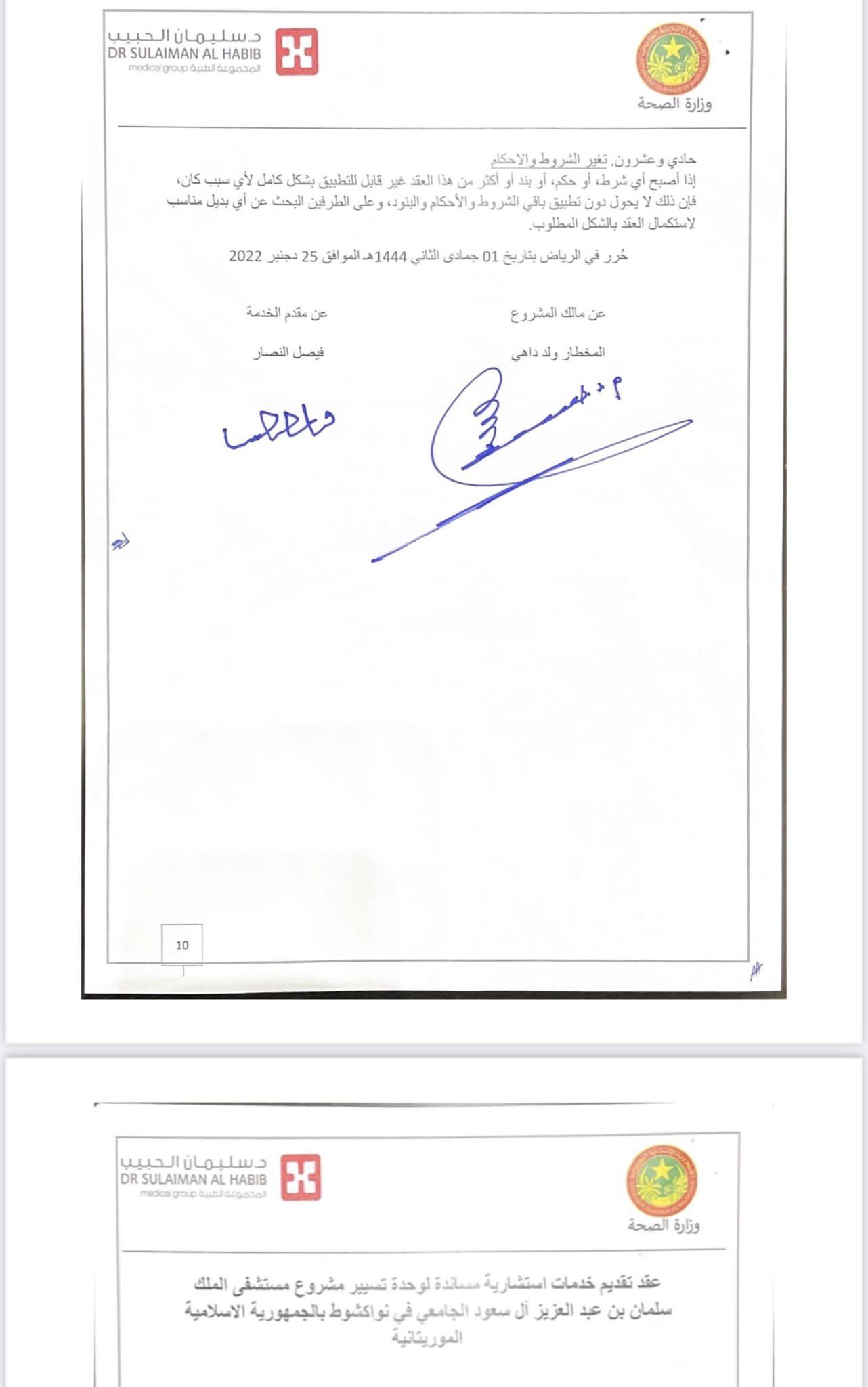 تقضى الاتفاقية بتكليف "مجموعة الحبيب" بالمساعدة الفنية فى اختيار مكاتب الدراسات و شركات الأشغال و مقاولات التجهيز لمستشفى الملك سلمان بن عبد العزيز بنواكشوط.