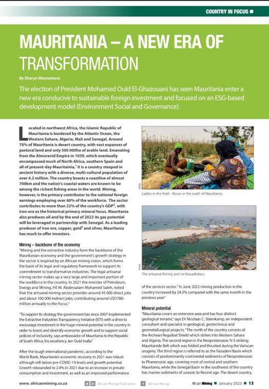 وركزت المجلة، في هذا العدد الخاص، على قطاع المعادن في موريتانيا، بوصفها البلد الذي حقق نجاحات مهمة في تحسين مناخ الاستثمار في مقدراته الكبيرة من المعادن.