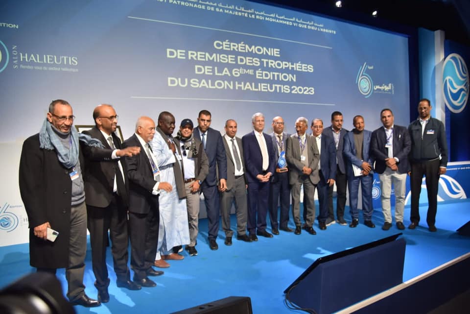 سلم وزير الصيد المغربي محمد صديقي جائزة أحسن معرض للجناح الموريتاني المشارك في معرض آليوتيس 2023 المقام فيلم أكادير بالمملكة المغربية.