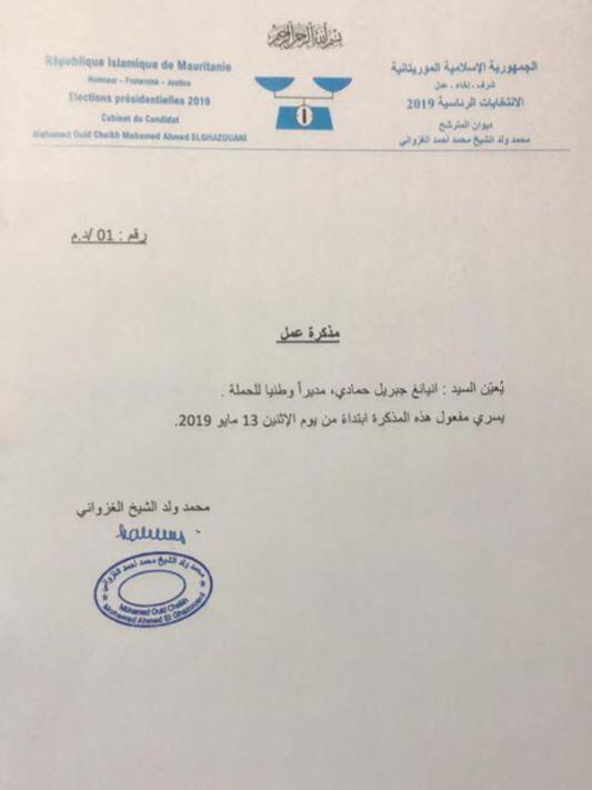 تضمنت مذكرة تحمل الرقم واحد وموقعة من طرف محمد ولد الشيخ الغزواني بتاريخ اليوم الإثنين تعيين مدير لحملته، ويتعلق الأمر بنيانغ جبريل هماد صاحب صفقة الميناء التي كان طرفها الموريتاني صهر ولد عبد العزيز حسب مصادر إعلامية أوردت الخير، وبهذا يكون عزيز هو المتنفذ الأول في حملة ولد الغزواني، فقد سبق وأن عين مديرها الإعلامي واختار لها مقرها وجمع لها المال على التجار، وها هو يعمل على فرض نفس قواعد اللعبة على الأطراف بغلق الباب أمام أي ترميم للجنة المستقلة للإنتخابات، بل ويسعى لكسب صفقة بطاقات الناخب ويروج من جهة أخرى على لسان من كان بالأمس يروج للمأمورية باسمه بأنه باق في السلطة من خلال الحزب، الأمر الذي يؤكد أن عزيز هو المترشح الحقيقي للسلطة خلف ترشيح غزواني.