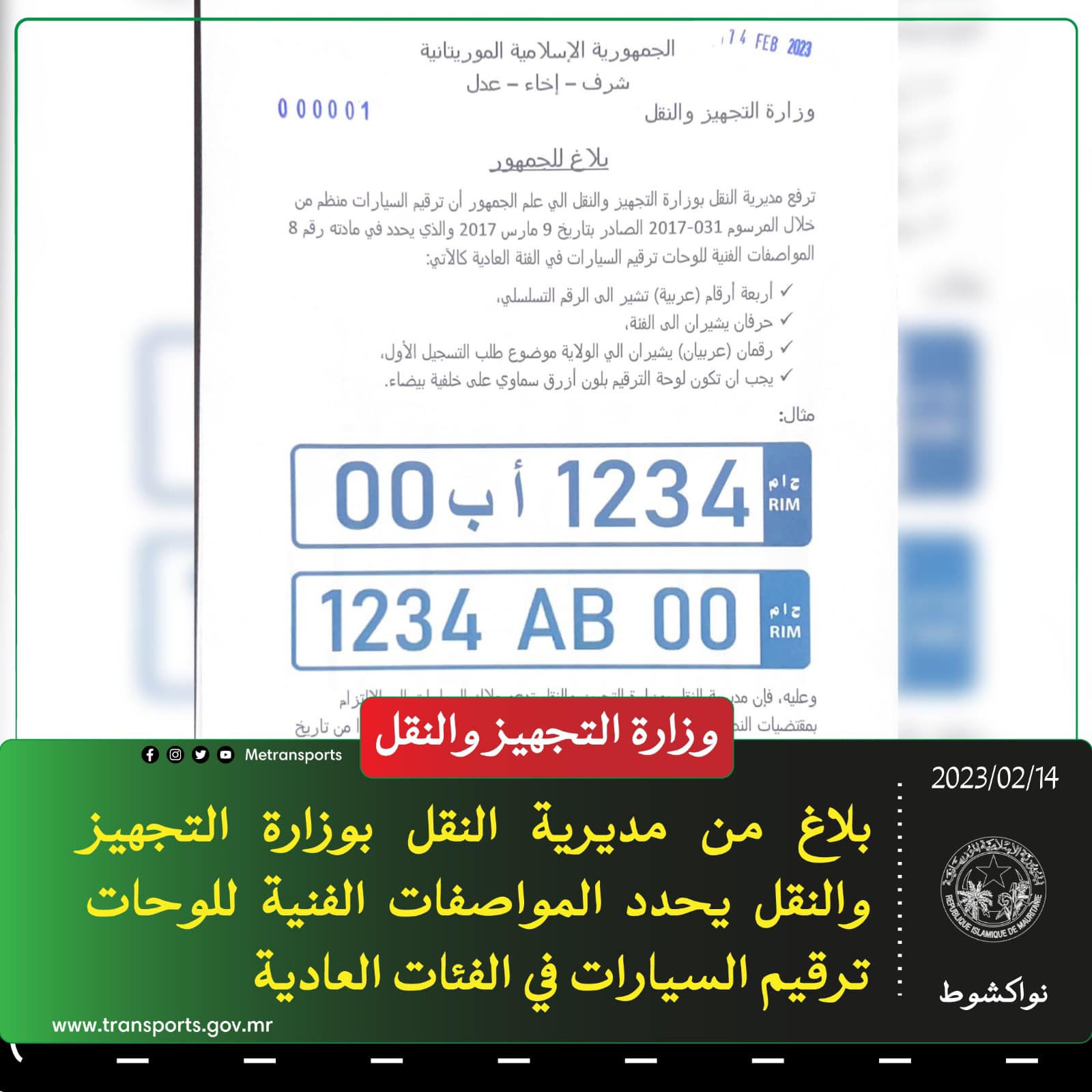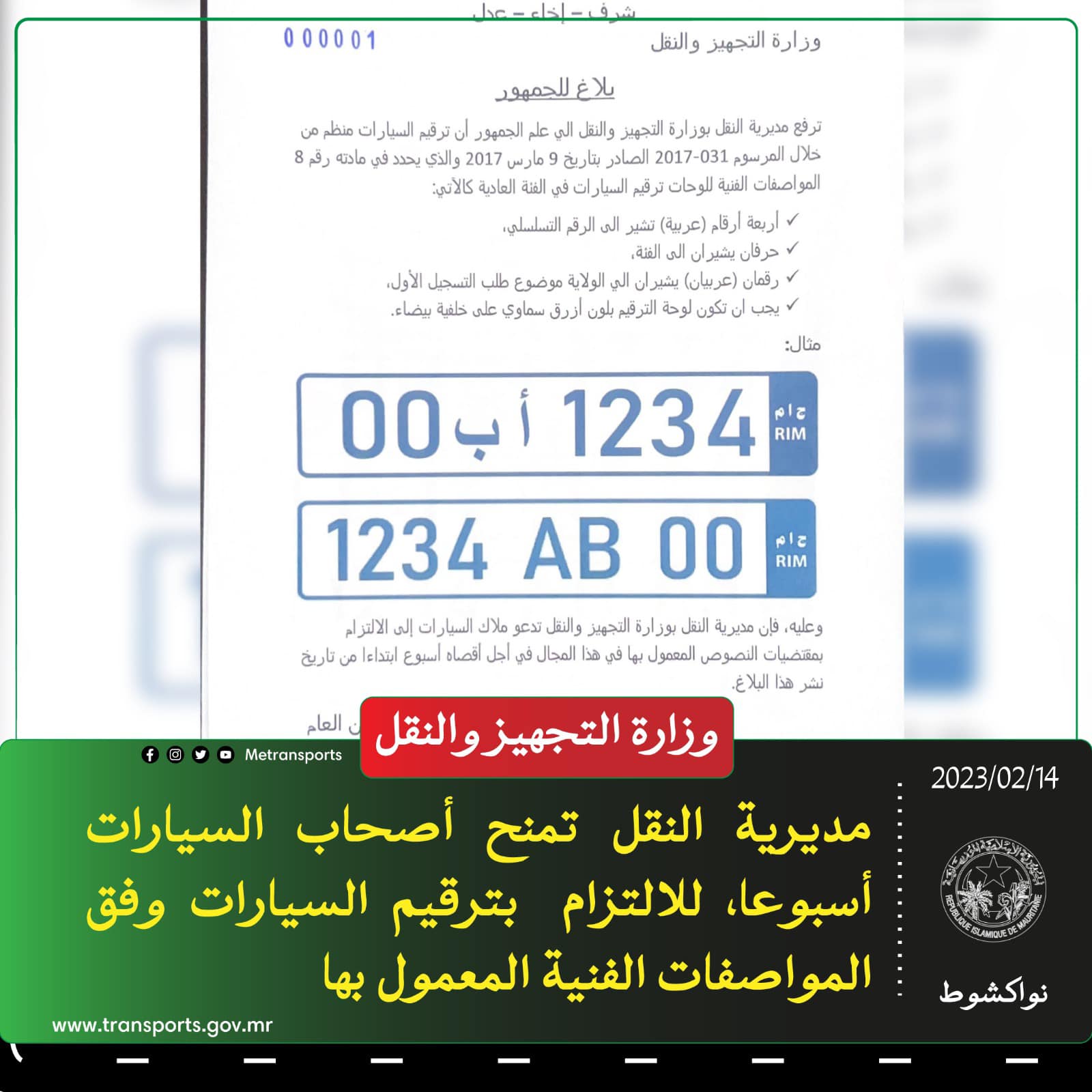 وزارة النقل الموريتانية تنشر أحرف ترقيم السيارت المعمول بها بالعربية والفرنسية(صورة)