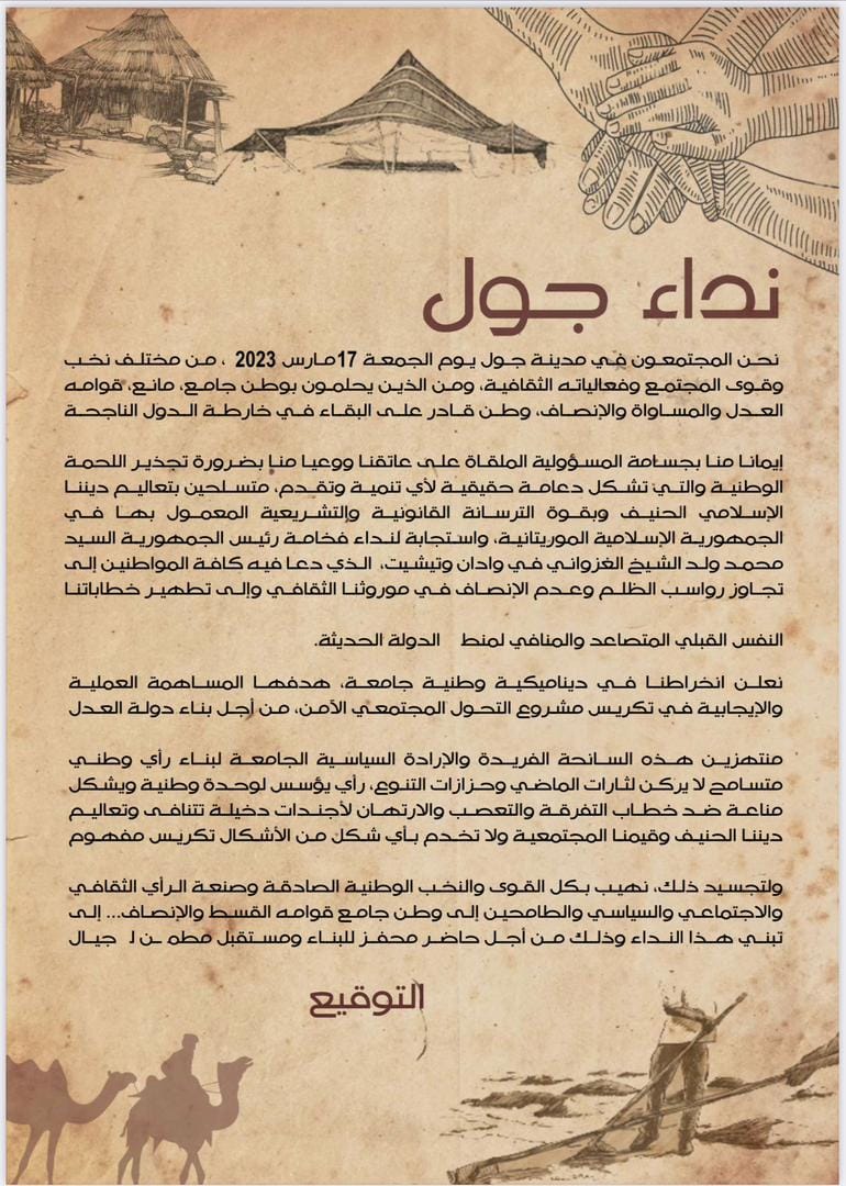 ويهدف نداء جول التاريخي الذي سبق وأن أشرف على توقيعه فخامة رئيس الجمهورية السيد محمد ولد الشيخ الغزواني ضمن فعاليات المهرجان الثقافي لجول في 17 من مارس المنصرم إلى تجذير اللحمة الوطنية ونبذ التفرقة وتعزيز قيم المواطنة الصالحة، والتي تعتبر دعامة حقيقية لأي تنمية وتقدم، استجابة لنداء فخامة رئيس الجمهورية في وادان وتيشيت، الذي دعا فيه كافة المواطنين إلى تجاوز رواسب الظلم وعدم الإنصاف في موروثنا الثقافي وتطهير الخطابات والمسلكيات من الأحكام المسبقة والصور النمطية الزائفة والوقوف في وجه النفس القبلي المتصاعد المنافي لمنطق الدولة الحديثة.