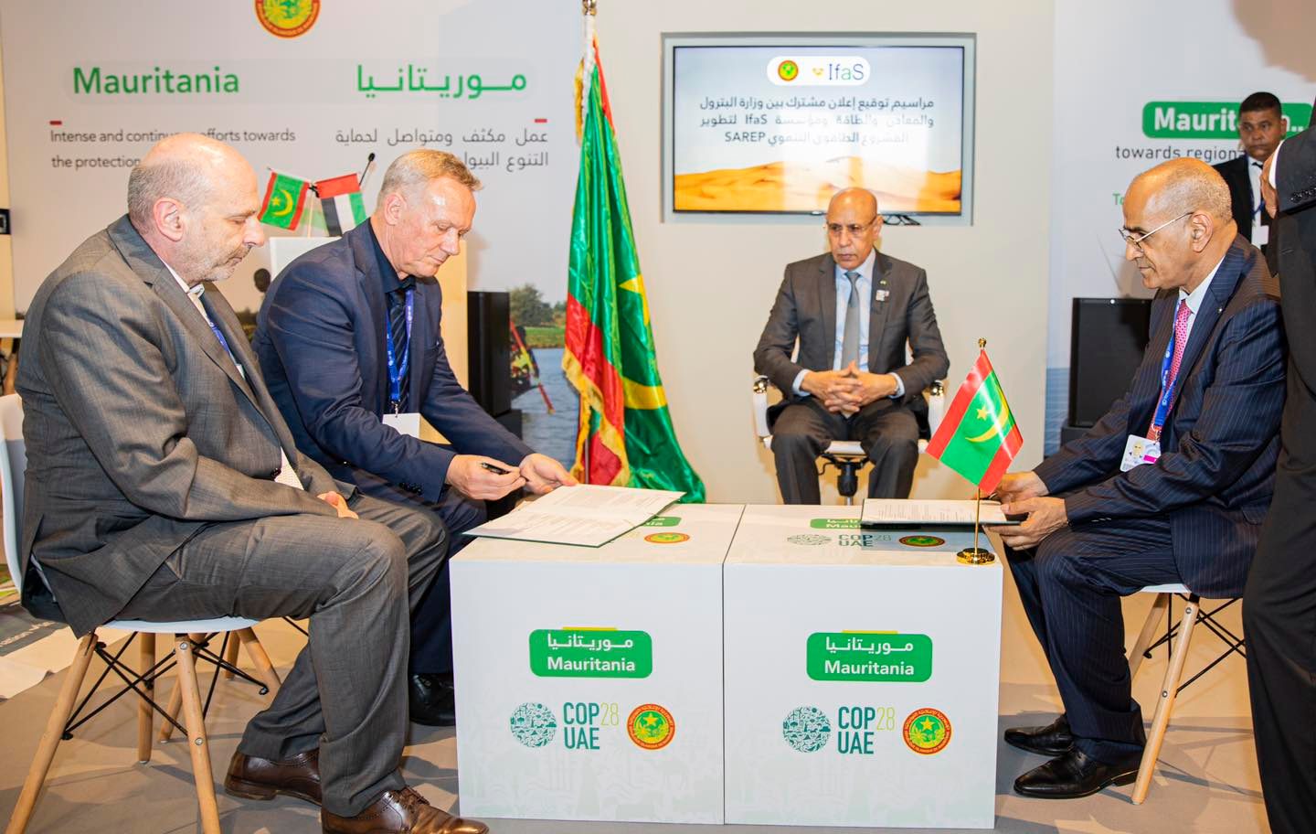 وقد أشرف الرئيس غزواني داخل الجناح الموريتاني، على توقيع مذكرتي تفاهم في مجال الاستثمار؛ إحداهما بين وزارة البترول والمعادن والطاقة وشركة اميا باور AMEA POWER.