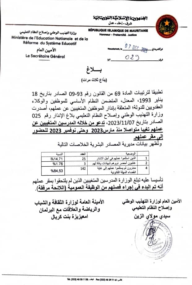 كما أكدت الوزارة أنه بدأت مساطر فصل 142 مدرسا موظفا تغيبوا عن عملهم تغيبا متواصلا من مارس 2023 وحتى نوفمبر 2023و ذلك بعد استنفاد مساطر التنبيه و الإبلاغ و الإنذار.
