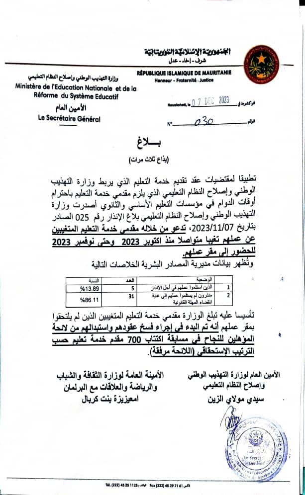 أعلنت وزارة التهذيب الوطني وإصلاح النام التعليمي أنها ستشرع في تنفيذ الفصل النهائي لـ 31 مقدم خدمة اكتتبوا بمسابقة نهاية سبتمبر 2023 ولم يلتحقوا بمواطن عملهم من 02 أكتوبر إلى نهاية نوفمبر.