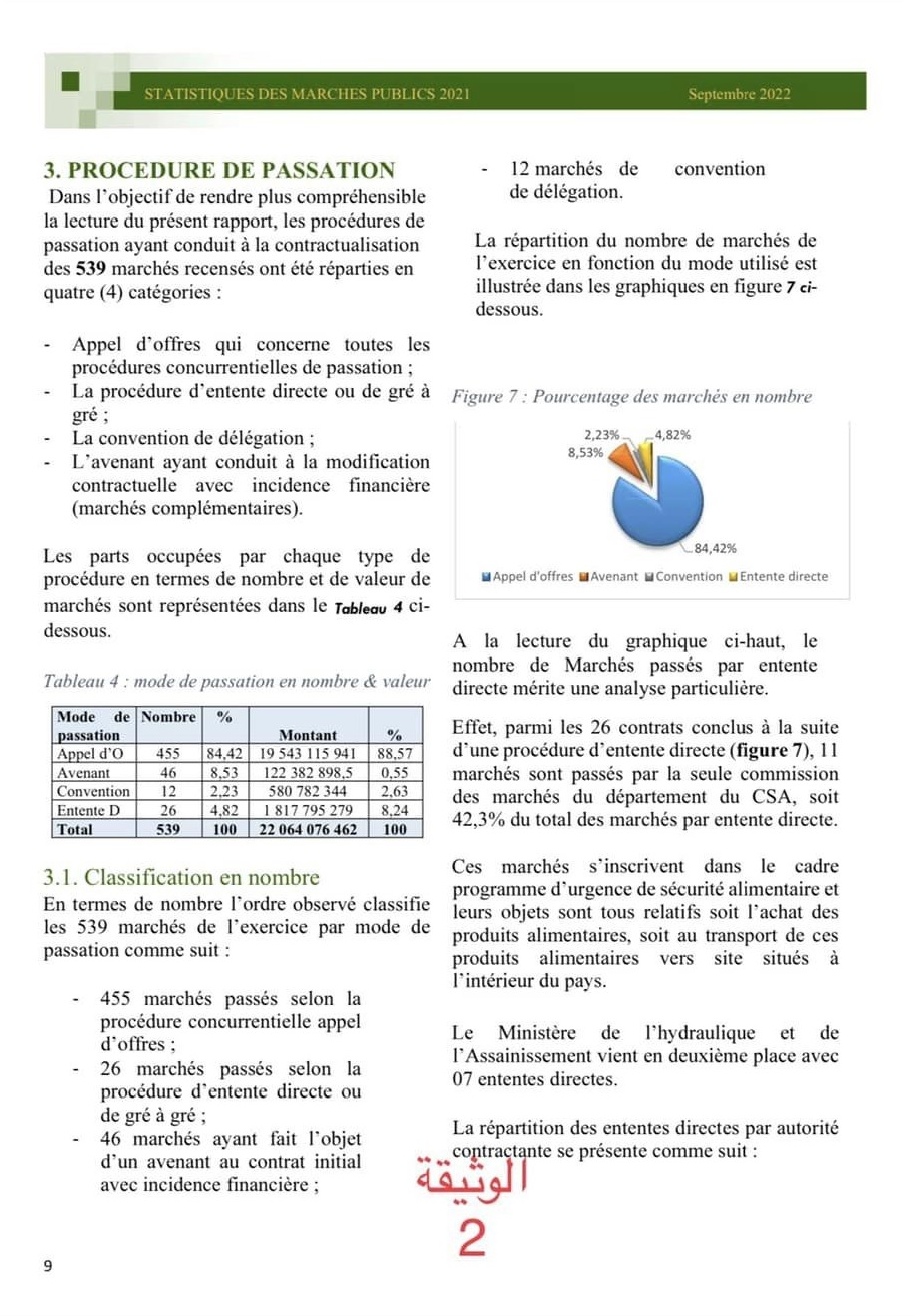 • أن سلطة تنظيم الصفقات تصدر تقارير مضللة – تحول منها نسخ لرئيس الجمهورية ورئيس البرلمان - لا تمت للشفافية بصلة، حيث ورد في تقريرها لسنة 2020 أن مجموع صفقات التراضي بلغت 20 مليارا في حين أنها زادت على 40 مليار (انظر الوثيقة 1 )، وأن مجموع صفقات التراضي لسنة 2021 كان 18 مليارا في حين أن صفقات التراضي في تلك السنة زادت على 100 مليارا (أنظر الوثيقة 2) .