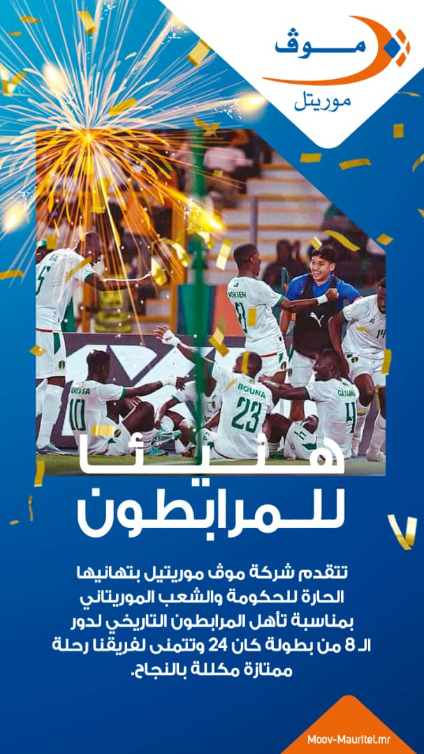 هنأت شركة موف موريتل للاتصالات الحكومة والشعب الموريتانيين بمناسبة تأهل المنتخب الوطني لكرة القدم "المرابطون" إلى الدور الثاني (ثمن النهائي) من كأس إفريقيا للأمم 2023 بكوت ديفوار. وتمنت الشركة للمنتخب الوطني رحلة موفقة مكللة بالنجاح.