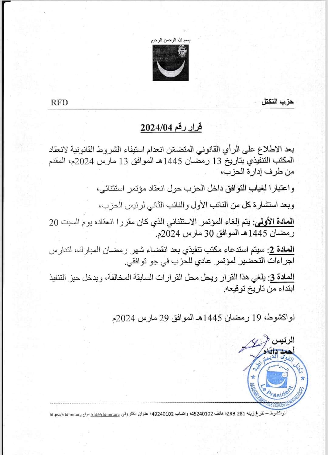 وأكدت المصادر أن ولد داداه قرر استدعاء المكتب التنفيذي بعد انقضاء شهر رمضان لتدارس إجراءات التحضير لمؤتمر عادي في جو توافقي.