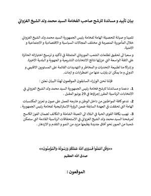 حصلت العلم على بيان أصدرته مجموعة من الوزراء السابقين أعلنوا خلاله تأييدهم ومساندتهم لترشح الرئيس محمد ولد الشيخ الغزواني.