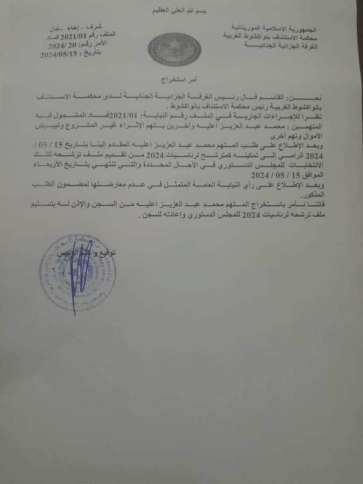 قالت مصادر إعلامية إن رئيس محكمة الاستئناف في نواكشوط أمر مسير السجن الذي يوجد فيه الرئيس السابق محمد ولد عبد العزيز بإخراجه من السجن لإيداع ملف ترشحه لرئيسات 20 يونيو 2024 للمجلس الدستوري وإعادته إلى السجن.
