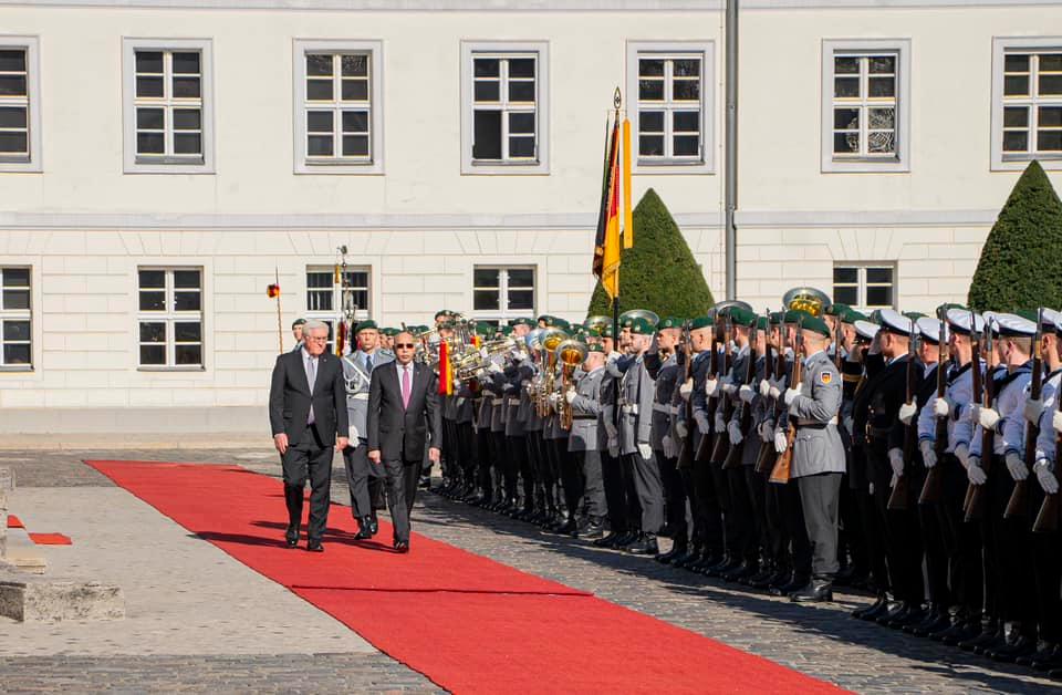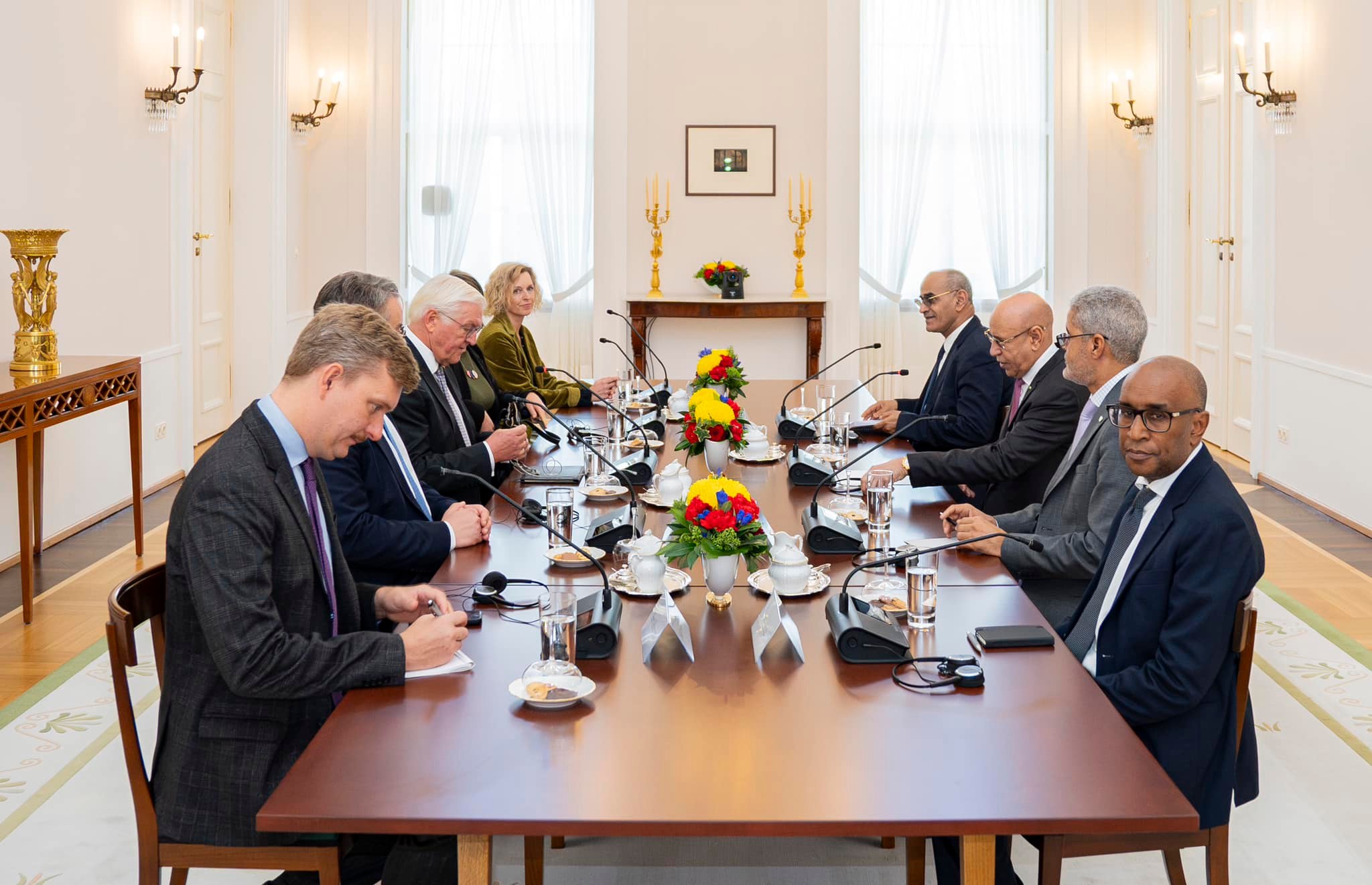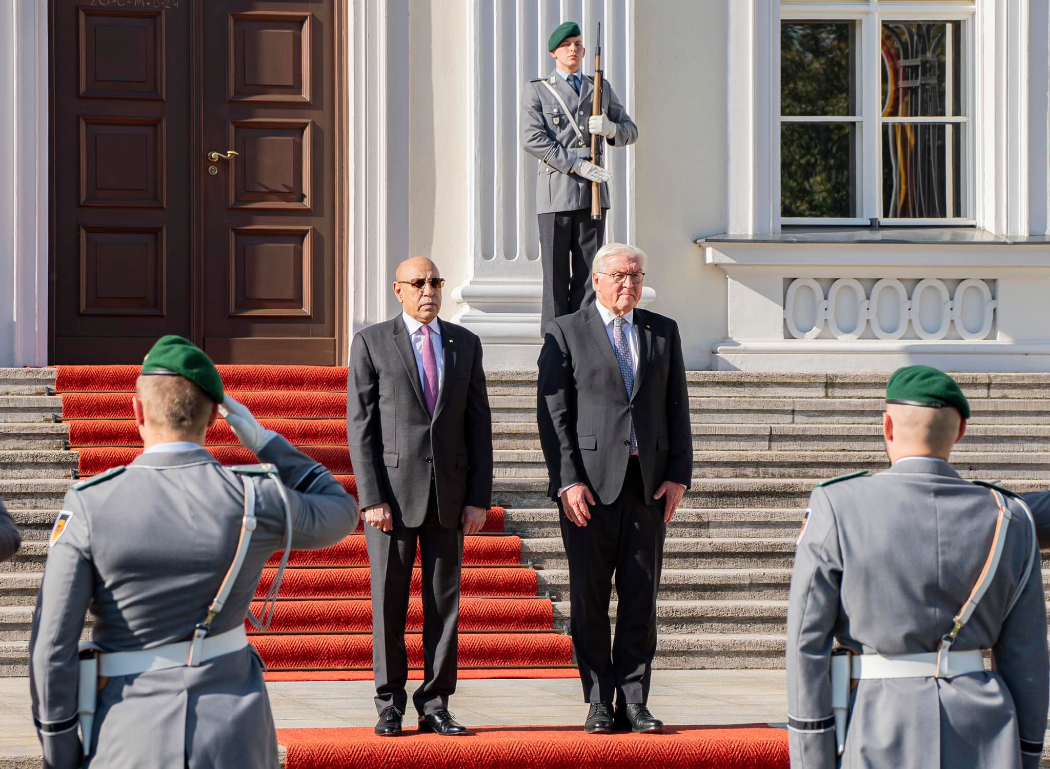 من جانبه قدم الرئيس الألماني التهانئ لفخامة رئيس الجمهورية على نجاح وتطور التجربة الديمقراطية في موريتانيا، معلنا استعداد ألمانيا لمواصلة التعاون مع موريتانيا ودعم سياساتها، مشيدا بدور موريتانيا المحوري في حفظ الأمن والاستقرار في المنطقة، ومهنئاً فخامة رئيس الجمهورية على سياسة العناية بالشباب وأهمية هذه الفئة في البناء الوطني وخطورة عدم احتضانها؛ مؤكدا استعداد ألمانيا لمزيد من الدعم في مجال التكوين المهني لصالح بلادنا.
