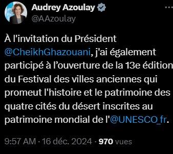 أشادت المديرة العامة لمنظمة الأمم المتحدة للتربية والعلم والثقافة (اليونسكو) أودري أزولاي، عبر سلسلة من التغريدات، على صفحتها على منصة إكس، وعلى موقع اليونسكو، بمهرجان مدائن التراث الذي حضرت نسخته الثالثة عشرة بدعوة من فخامة رئيس الجمهورية السيد محمد ولد الشيخ الغزواني.