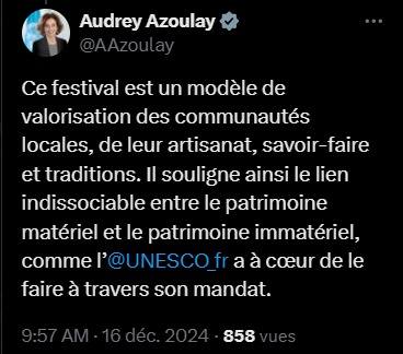وأضافت أن المهرجان لم يقتصر على الاحتفاء بالماضي، بل يعزز العلاقة الوثيقة بين التراث المادي وغير المادي، وهو ما تحرص اليونسكو على دعمه ضمن رسالتها العالمية.