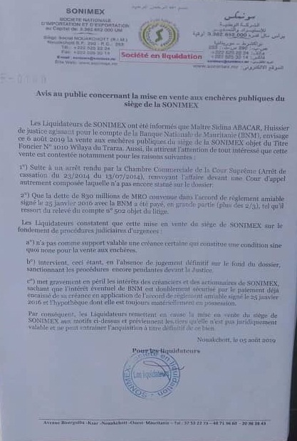 أعلنت اللجنة المكلفة بتصفية الشركة الموريتانية للإيراد والتصدير "سونمكس" عن مناقصة لبيع مقر الشركة مفتوحة أمام العموم.
