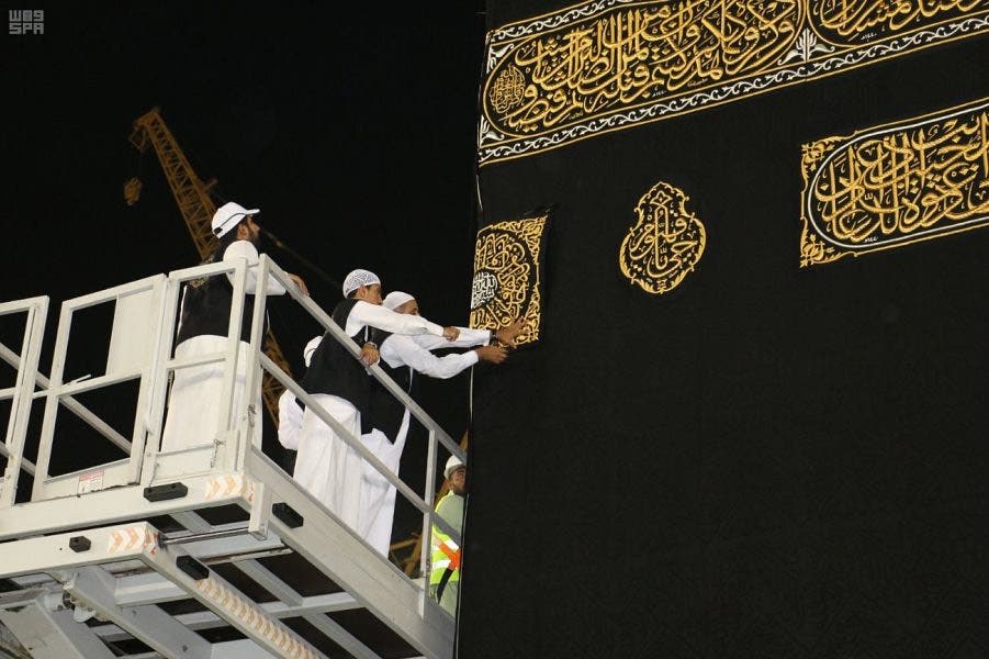 وفي تقرير وكالة الأنباء السعودية "واس"، أفاد وكيل الرئيس العام لشؤون المسجد الحرام أحمد المنصوري أنه تم، الجمعة، إنزال الكسوة القديمة للكعبة، وإلباسها الكسوة الجديدة، والمكونة من أربعة جوانب مفرقة وستارة الباب، حيث تم رفع كل جنب من جوانب الكعبة الأربعة على حدة إلى أعلى الكعبة المشرفة تمهيداً لفردها على الجنب القديم، وتم تثبيت الجنب من أعلى بربطها وإسقاط الطرف الآخر من الجنب، بعد أن تم حلّ حبال الجنب القديم، بتحريك الجنب الجديد إلى أعلى وأسفل في حركة دائمة، بعدها سقط الجنب القديم من أسفل وبقي الجنب الجديد، وتكررت العملية أربع مرات لكل جانب إلى أن اكتمل الثوب، ثم بعدها تم وزن الحزام على خط مستقيم للجهات الأربع بخياطته.