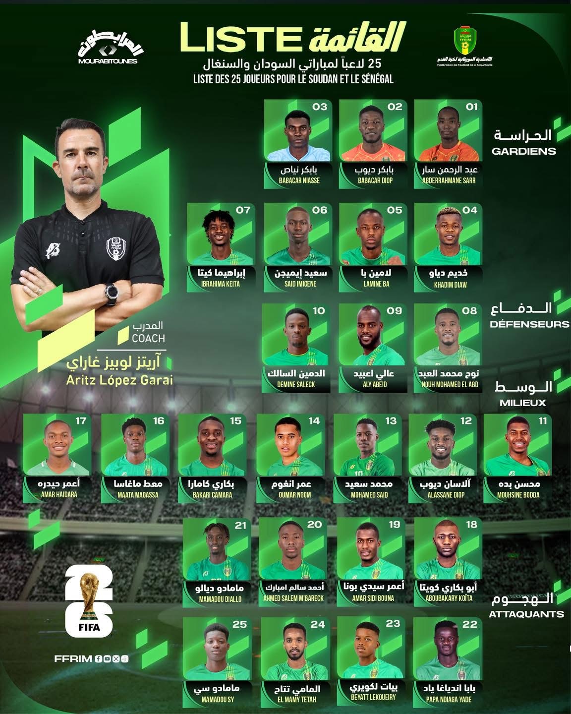 وسيخوض المنتخب الموريتاني مباراتين الأولى أمام السودان يوم 10 أكتوبر الجاري في دار السلام، بينما ستكون الثانية أمام السنغال يوم 14 أكتوبر الجاري في ديامنياديو لحساب الجولتين التاسعة والعاشرة من تصفيات كأس العالم 2026.