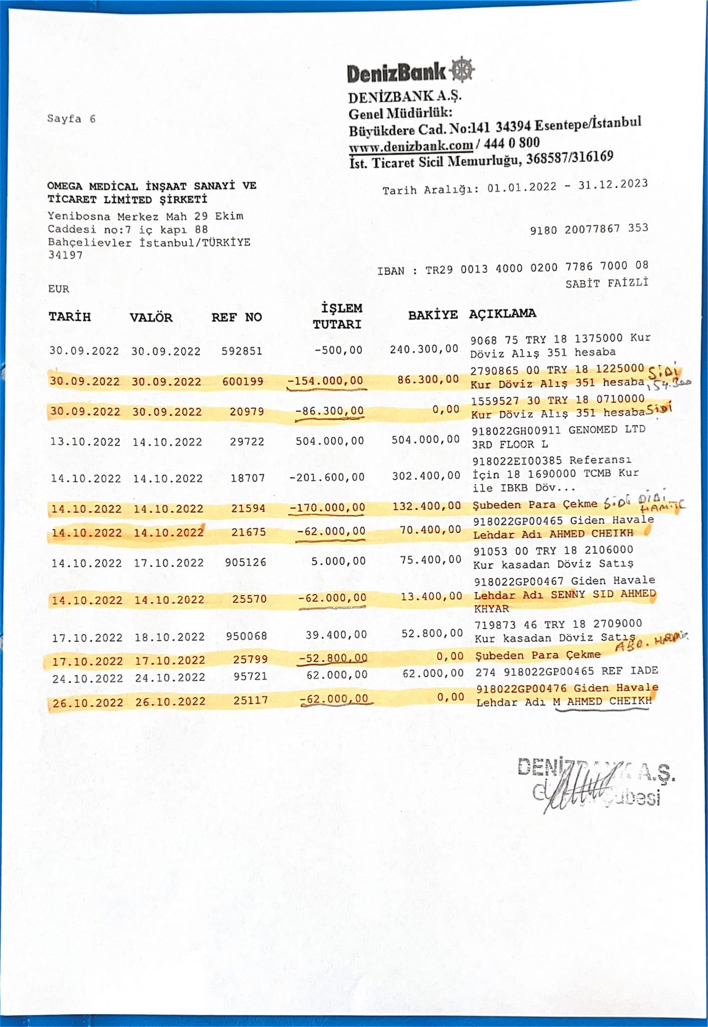 9. تُظهر الكشوفات البنكية مسار الأموال من Genomed إلى حسابات Omega، ومنها إلى صرافة غزلان ثم إلى دبي.