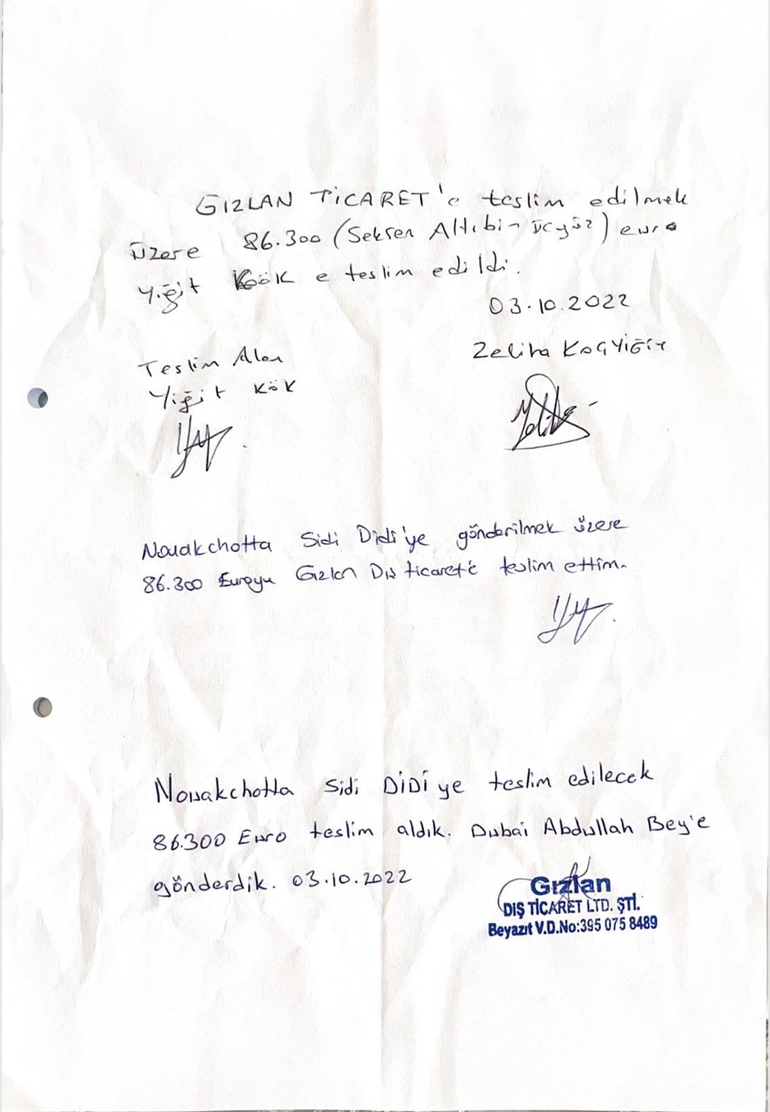 10. تبين الكشوفات حصول كل من أحمد الشيخ والسني سيد احمد خيار على مبلغ قدره 164 ألف يورو، كما تُظهر الإيصالات وكشوف الصرافة حصول سيدي ولد الديدي على ما يقارب 1.5 مليون يورو ونصف مليون دولار أمريكي.